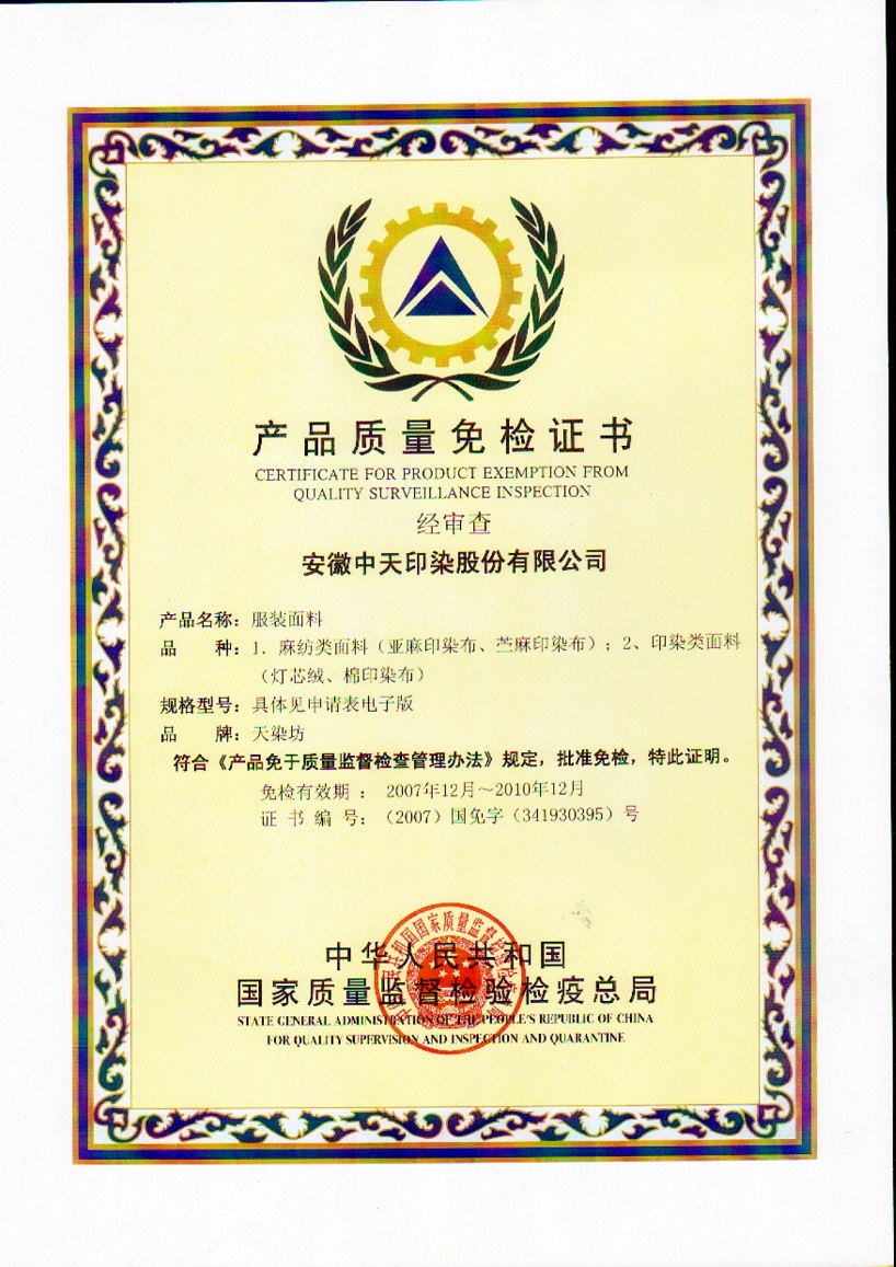 2007年榮獲產(chǎn)品質(zhì)量免檢證書