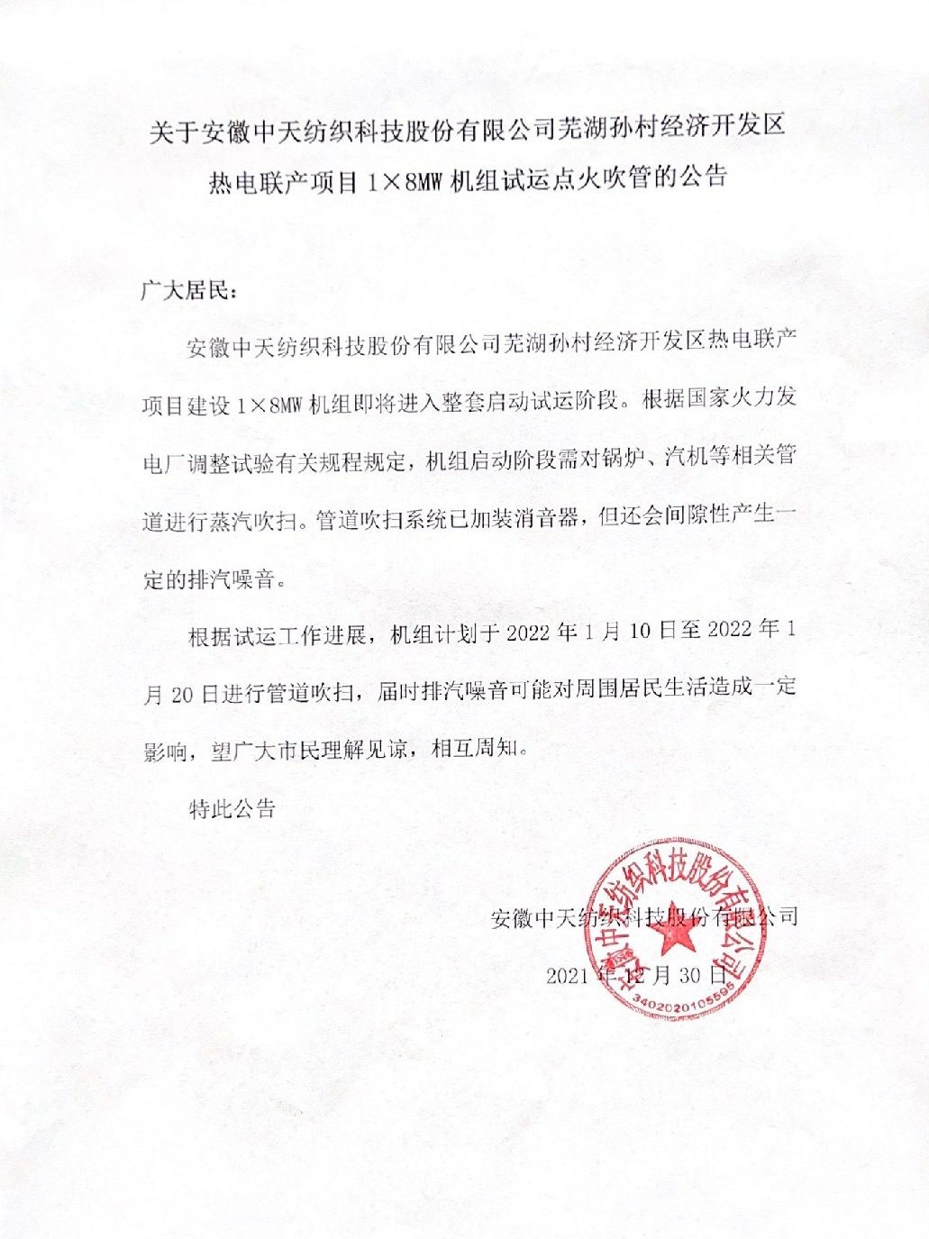 蕪湖孫村經(jīng)濟(jì)開(kāi)發(fā)區(qū)熱電聯(lián)產(chǎn)項(xiàng)目1X8MW機(jī)組試運(yùn)點(diǎn)火吹管公告