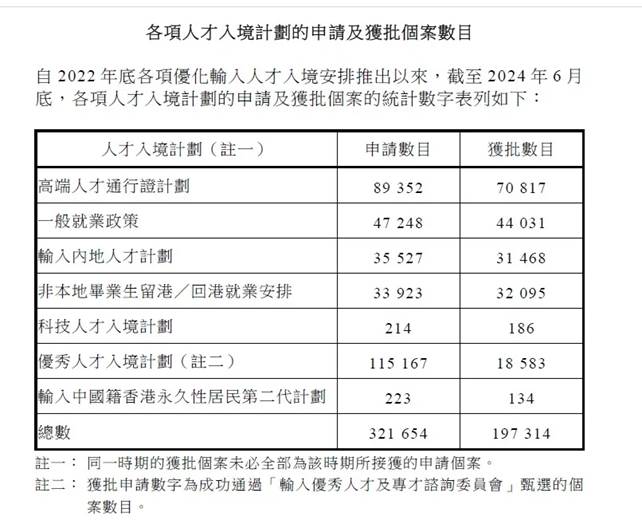 從目前數(shù)據(jù)來看,港府已經(jīng)超額完成吸引人才“指標”。據(jù)立法會披露的文件,截至2024年6月底,經(jīng)過各項人才入境計劃共接收了超過32萬份申請,其中近20萬宗申請已獲批準,超過13萬名人才已經(jīng)抵達香港。根據(jù)香港入境事務處最新公布的統(tǒng)計數(shù)據(jù),2024年第一季度,成功獲批的申請案例數(shù)量上升至2,735宗,較去年同期增加了662宗,實現(xiàn)了約32%的顯著增長。