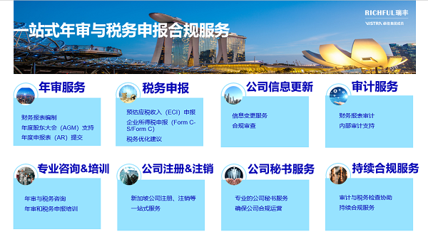 新加坡公司年審和稅務(wù)申報(bào)是確保企業(yè)合規(guī)運(yùn)營的重要環(huán)節(jié),及時(shí)、準(zhǔn)確地完成這些工作不僅能避免罰款和處罰,還能為企業(yè)的長期發(fā)展奠定堅(jiān)實(shí)基礎(chǔ)。提前規(guī)劃、妥善準(zhǔn)備,并借助專業(yè)團(tuán)隊(duì)的力量,確保企業(yè)合規(guī)運(yùn)營。針對新加坡公司年審和稅務(wù)申報(bào),RICHFUL瑞豐可以為您提供以下專業(yè)服務(wù):