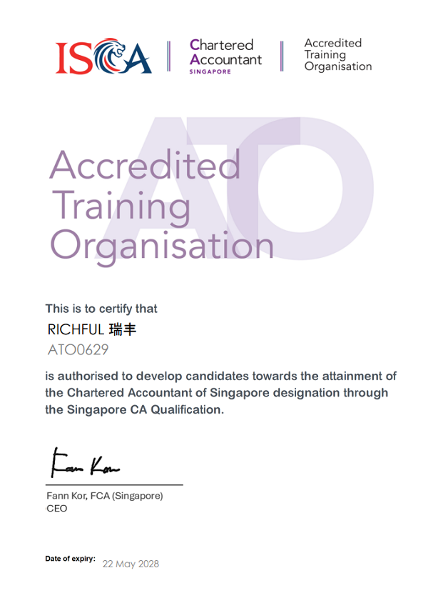近期,RICHFUL瑞豐通過新加坡特許會計師協(xié)會(The Institute of Singapore Chartered Accountants, ISCA)審核,正式獲得“認證培訓雇主”(Accredited Training Organisation, ATO) 資格。該資質(zhì)表明RICHFUL瑞豐在會計人才培養(yǎng)體系及專業(yè)實踐機制上符合ISCA國際標準,為企業(yè)深化國際化人才戰(zhàn)略奠定基礎(chǔ)。