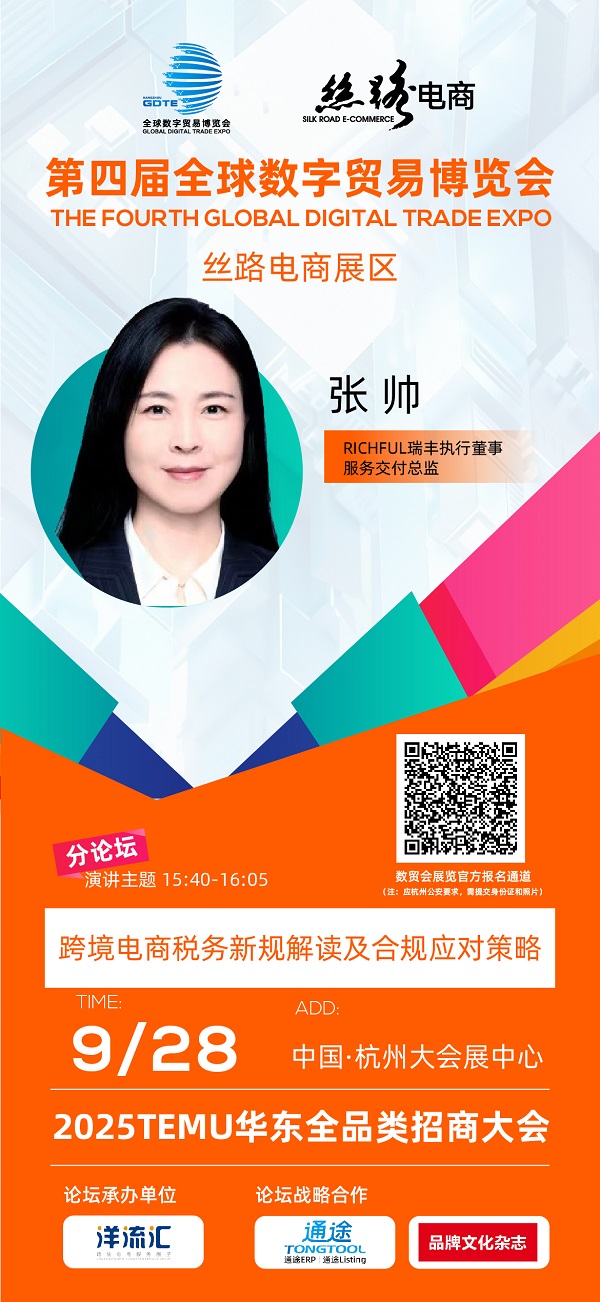 展會(huì)期間(9月28日),RICHFUL瑞豐執(zhí)行董事、服務(wù)交付總監(jiān)張帥女士將出席2025TEMU華東全品類招商大會(huì),發(fā)表《電商新規(guī)解讀及跨境電商稅務(wù)全球稅務(wù)考量》重磅演講。屆時(shí)將權(quán)威解讀2025年15號(hào)、17號(hào)公告最新政策,深入剖析四大合規(guī)模式的適用場(chǎng)景與落地策略,幫助企業(yè)應(yīng)對(duì)全鏈條穿透式監(jiān)管新挑戰(zhàn)。