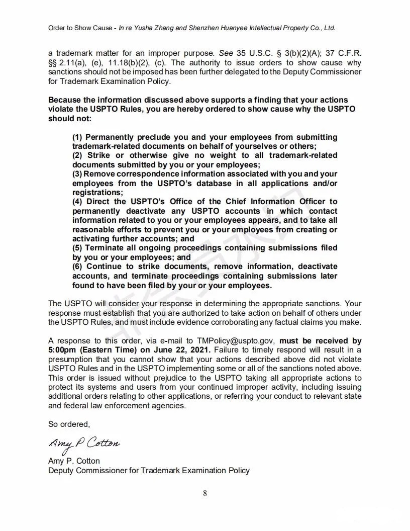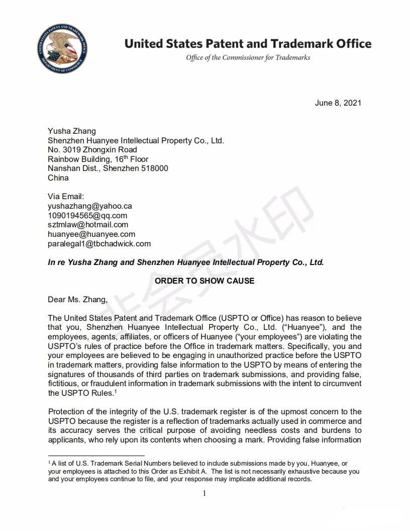 2021年6月8日,美國專利商標局(USPTO)向中國深圳一家知識產權公司的代表人發(fā)出一份123頁的“ORDER TO SHOW CAUSE”。對該公司代理提交的批量美國商標的行為,尤其是其中涉及到第三方簽名提供虛假、虛構和欺詐信息的行為提出質疑,要求該公司提出合理的理由,并在美國東部時間6月22日下午5:00前進行回復。否則USPTO將會對該代理機構以及代表人進行制裁。